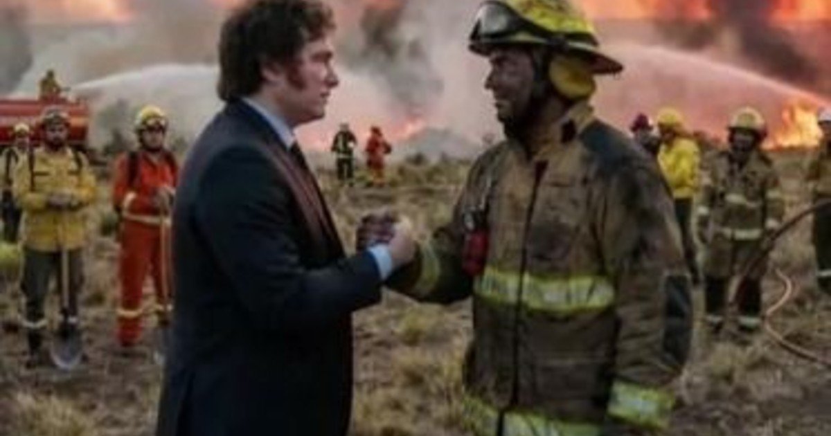 Milei no viajó a la zona de los incendios, pero compartió una imagen hecha con IA que lo muestra saludando a los brigadistas en Chubut